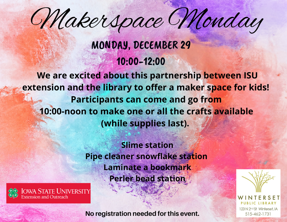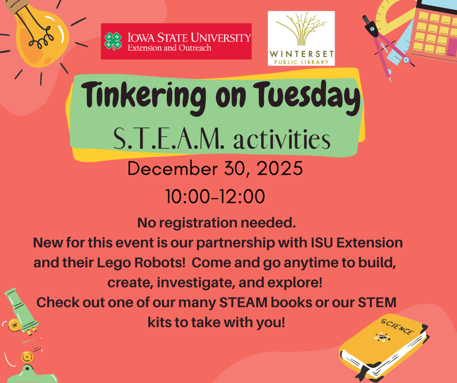Welcome to Winterset Public Library’s virtual library! Explore the tabs, buttons, and links to discover the numerous free resources and downloadable items we offer online. Check out the calendar to discover entertaining and educational programs and events for all ages. If you do not find what you need here, our staff is pleased to assist you when you visit in person or you can call or send an email.